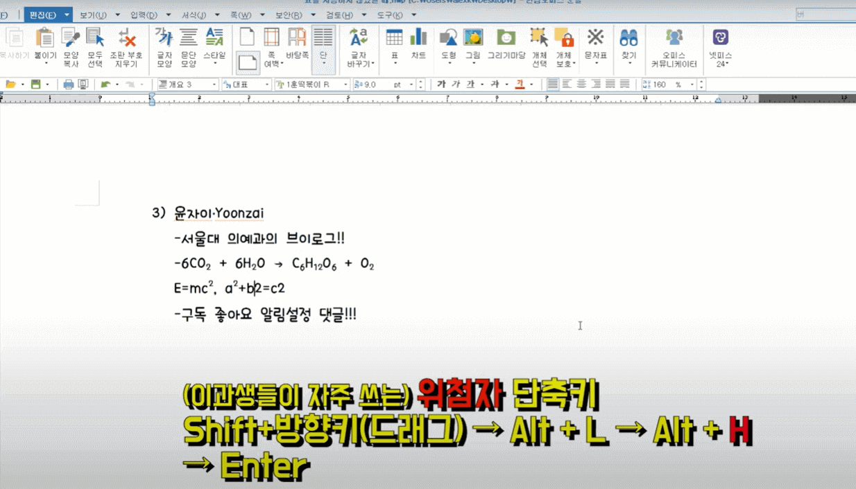 이과생들이 자주 쓰는 위첨자 단축키 Shift+방향키(드래그) > Alt+L > Alt+H > Enter입니다.