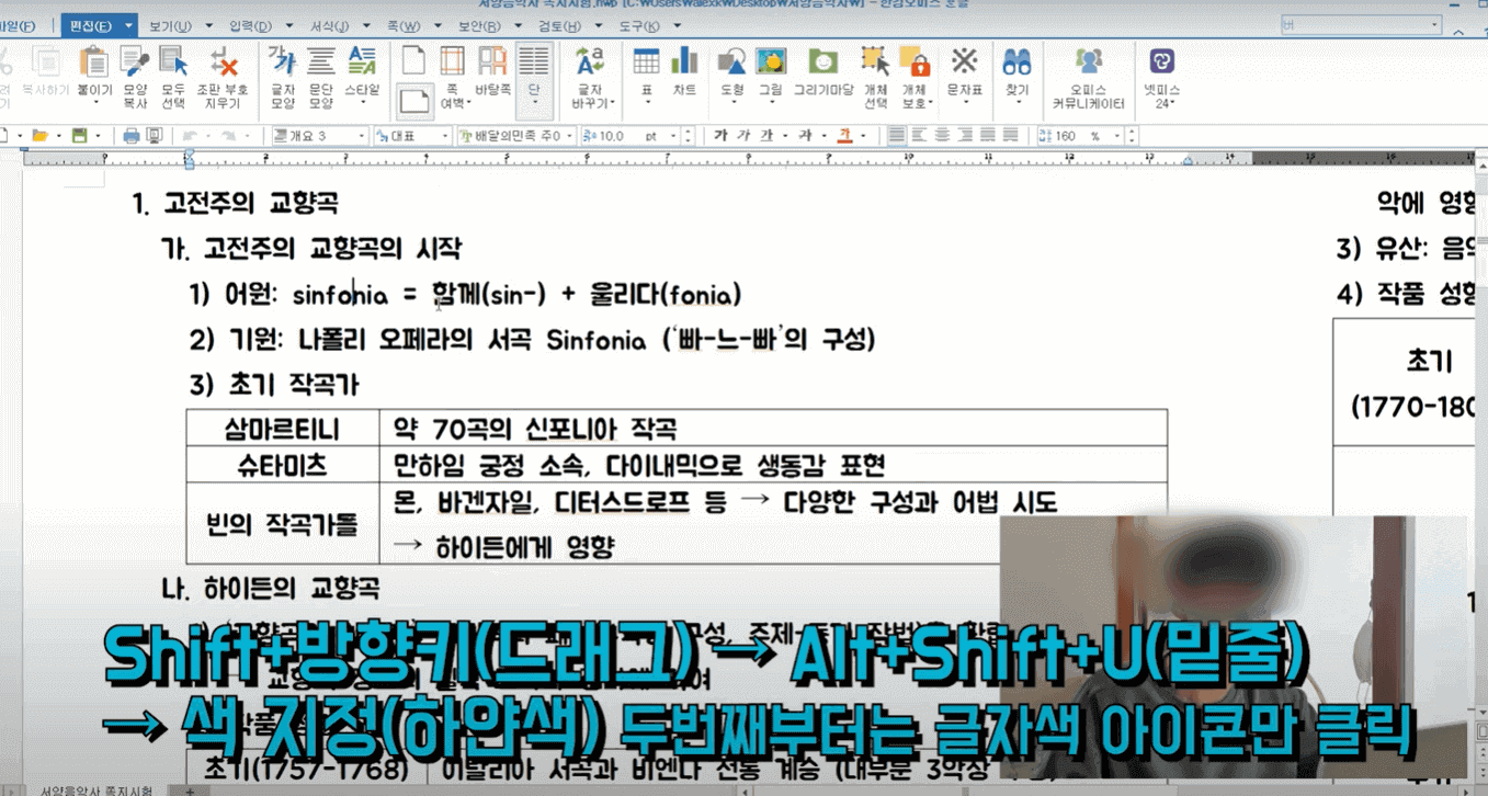 이제 파일로 들어가서 내가 외우고 싶은 모든 부분에 빈칸을 뚫어주면 됩니다. Shift+방향키(드래그) > Alt+Shift+U(밑줄) > 색 지정(하얀색)을 하고, 두 번째부터는 글자색 아이콘만 클릭합니다.