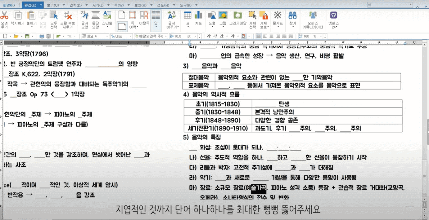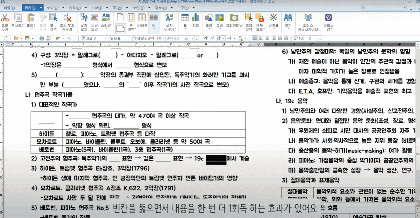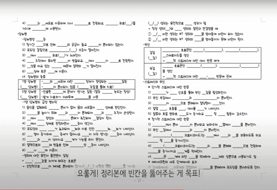 위의 과정까지 끝나셨다면 빈칸을 뻥뻥 뚫을 차례입니다. 바로 쪽지시험을 만들어 줄 겁니다. 밑에 그림처럼 정리본에 빈칸을 뚫어주는 게 목표입니다.