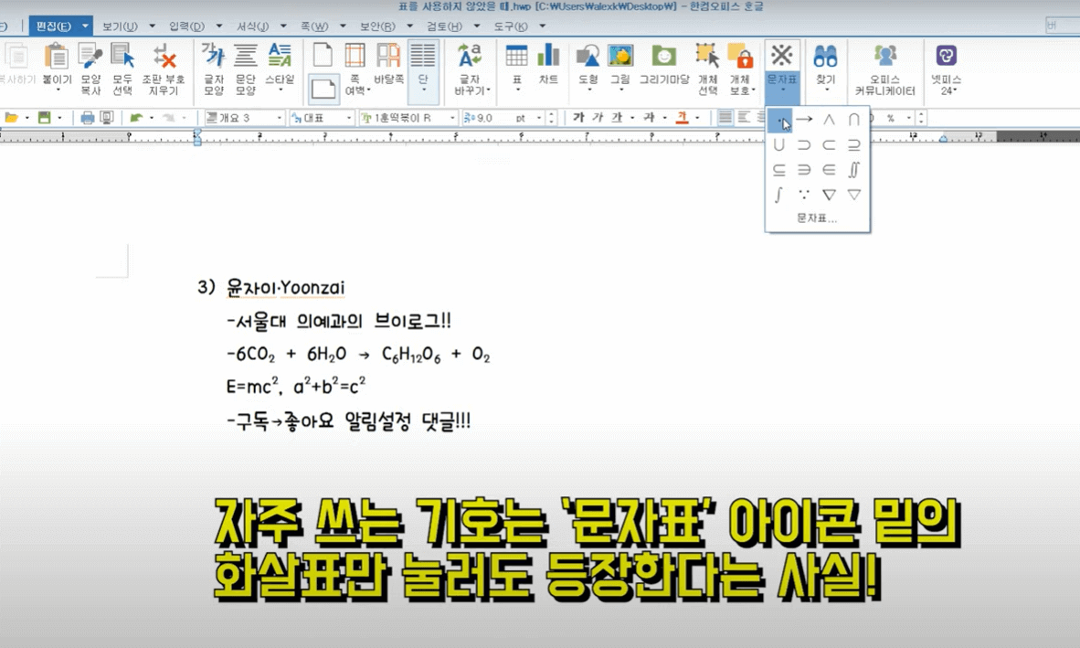 자주 쓰는 기호는 문자표 아이콘 밑의 화살표만 눌러도 등장한다는 사실을 기억해 두면 좋습니다.