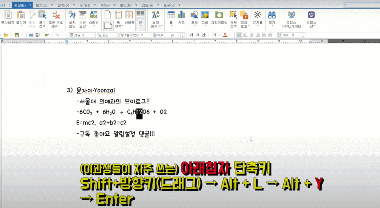 이과생들이 자주 쓰는 아래첨자 단축키는 Shift+방향키(드래그) > Alt+L > Alt+Y > Enter입니다.