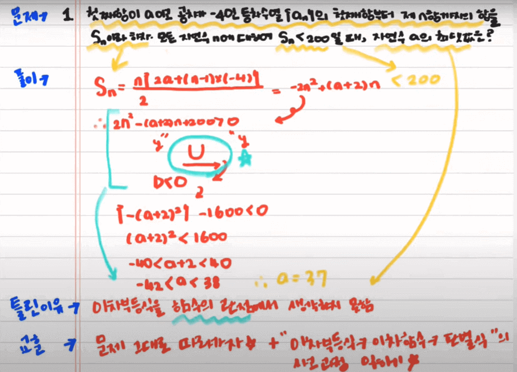 기출문제를 푼 후부터가 진짜 중요한데 여기서부터 실력이 본격적으로 늘기 때문에 집중해 주시기 바랍니다. 기출문제에서 틀린 문제들은 오답노트를 써줄 겁니다. 기출문제에 있는 문제들을 나의 것으로 만드는 가장 빠른 방법은 오답노트를 쓰는 것입니다. 오답노트에 내가 어려워하는 문제들을 모아놓고 10번 이상 읽다 보면 머리가 아무리 나빠도 이해가 되실 겁니다. 오답노트에 틀린 문제를 적고 해설을 적고 틀린 이유와 교훈을 작성하시면 됩니다. 문제를 적는 이유는 문제를 읽는 태도를 교정하기 위함입니다. 문제를 적으면서 '내가 너무 빠르게 읽어서 문제의 조건을 놓치는 태도가 있구나~', '이 조건이 뜻하는 바를 이해하지 못했구나'를 파악할 수 있습니다. 그래서 문제를 적어주고 해설을 적으면 되는데, 이 해설을 그냥 적는 게 아니라 '이해하면서' 천천히 적어주면 됩니다. 이때, 문제의 조건 놓침, 계산실수, 개념부족 등등 내가 이 문제를 틀린 이유를 구체적으로 작성해 주시면 됩니다. 그러고 나서 오답노트를 여러 번 읽어주시면 됩니다.