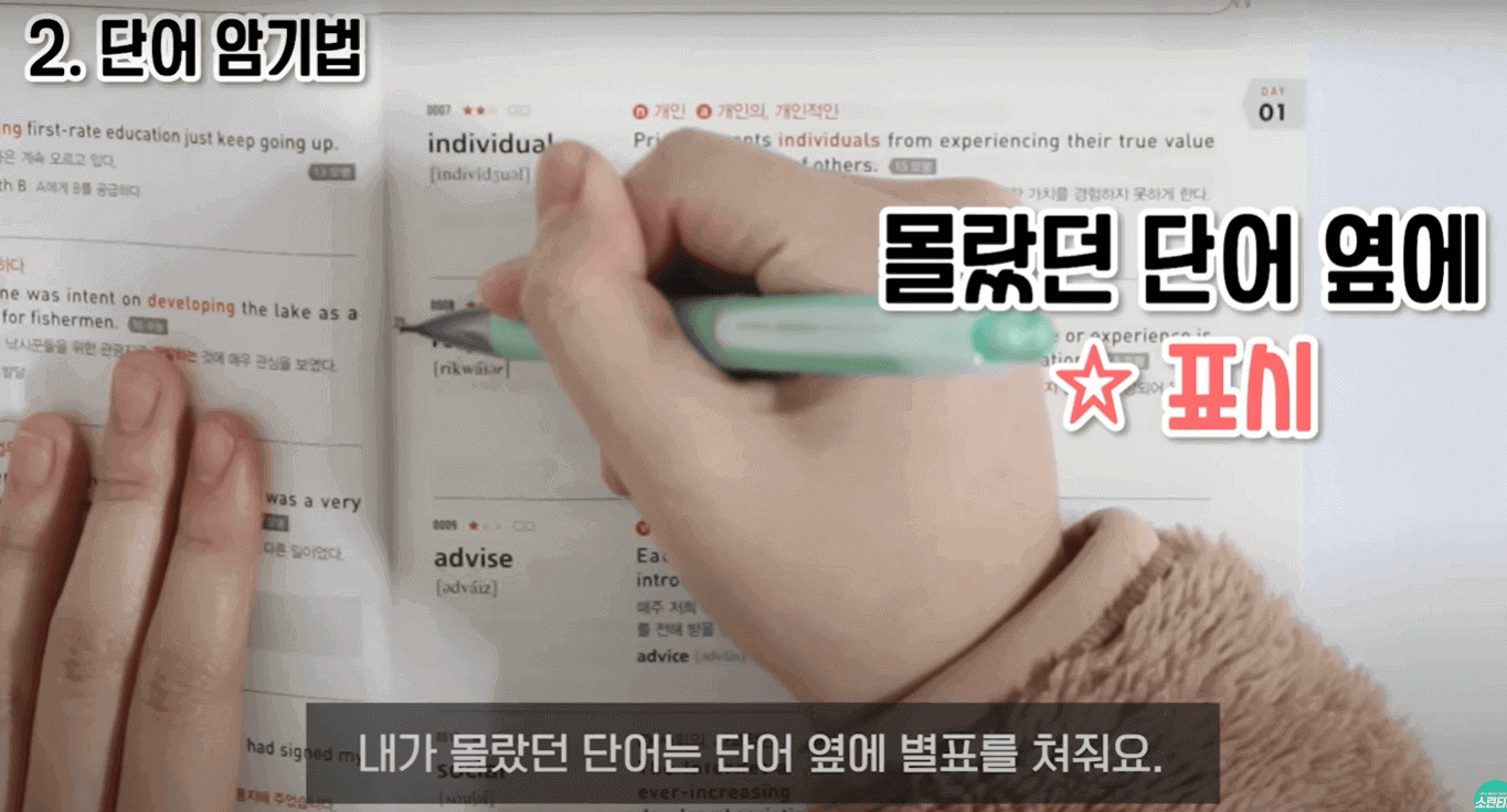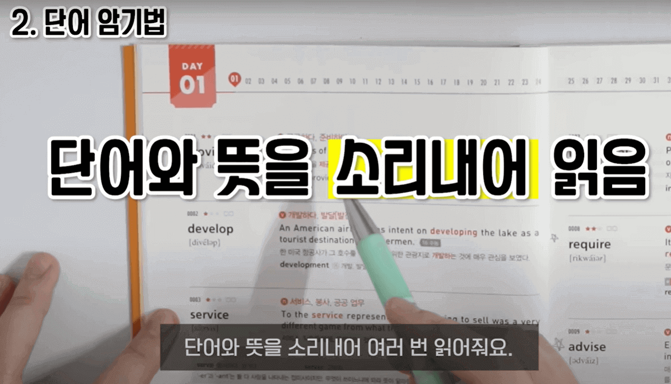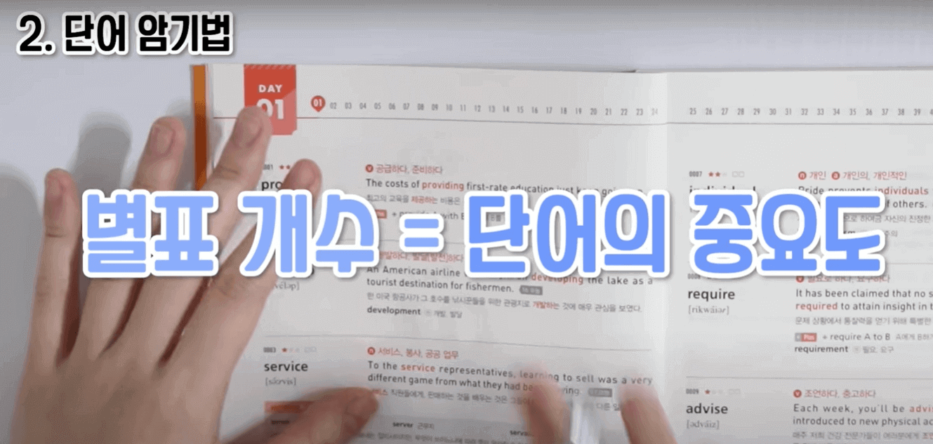 이렇게 체계화된 공부 방법은 지금까지 설명드린 것까지인데, 그냥 수시로 밥 먹다가도 예를들어, DAY31을 하고 있었다, 그런데 그냥 갑자기 생각나면 DAY9도 한 번 쭉 눈으로 봐보고, 내가 까먹은 단어가 있다 하면 또 단어 앞에 별표를 치고 이런 식으로 수시로 복습을 해주었습니다. 이런 식으로 단어 공부를 했고, 처음부터 끝까지 다하면 책 1 회독을 한 것입니다. 그런데 1 회독으로 끝나면 절대 안 되고, 2, 3 회독을 해주었습니다. 그렇게 해야 이 단어장 하나를 마스터한 거라고 생각을 했습니다. 이렇게 공부를 해준 후에 다른 단어장으로 넘어갑니다.