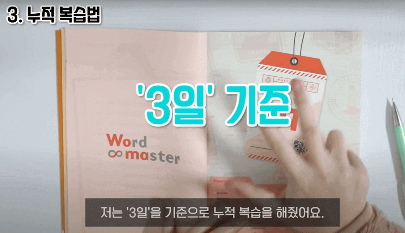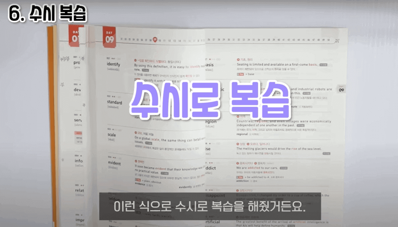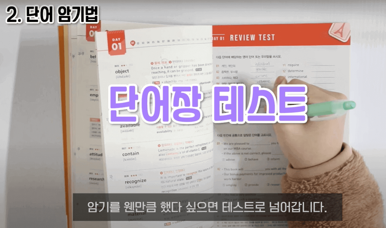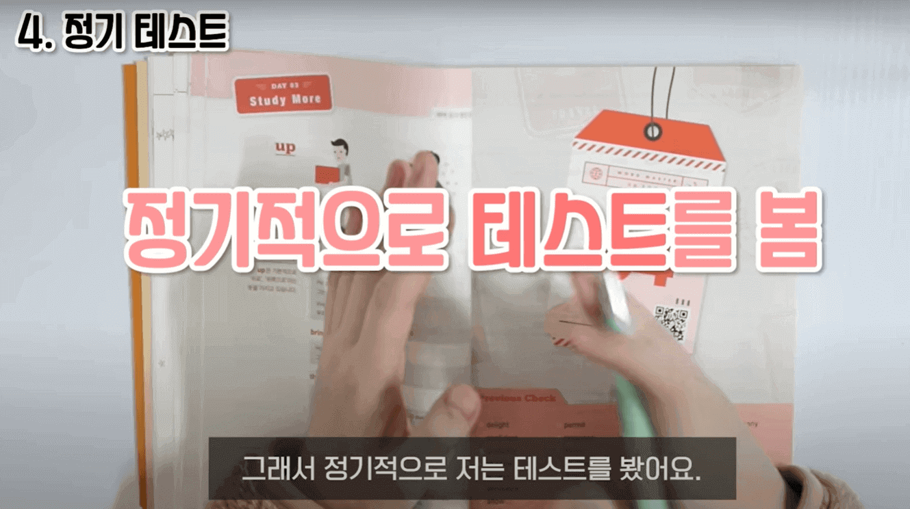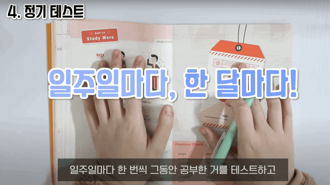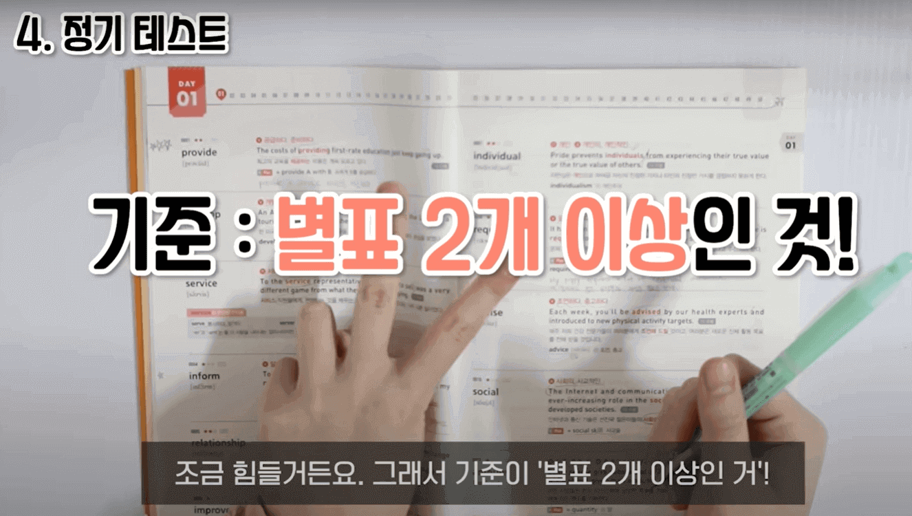 누적 복습하는 방법에 대해서 말씀드리겠습니다. 3일 기준으로 누적 복습을 해줬습니다. 예를 들어서 DAY1을 오늘 공부했다고 하면 내일은 DAY1과 DAY2를 같이 공부해줍니다. 당연히 메인 공부 부분은 DAY2이고, DAY1은 어떻게 복습하냐면 단어와 뜻이 나와 있는 페이지에서 뜻만 가리고 뜻을 말해봅니다. 그래서 막히거나, 잘못 말한 단어들은 또 그 단어 앞에 별표 표시를 해줍니다. 부족하다 싶으면 한 번 가볍게 테스트를 쭉 해주고 별표 표시한 거는 다시 한번 암기를 꼼꼼하게 해 줍니다. 그리고 나머지 단어들은 간단하게 눈으로만 훑어줍니다. 이렇게 하면 시간이 오래 안 걸리는 이점이 있습니다. 그다음 DAY2는 아까 그 하루 공부법대로 공부를 해주면 됩니다. 그리고 3일째가 되면 DAY1, DAY2를 간단하게 테스트 및 복습을 해주고 DAY3를 메인으로 암기해 주면 됩니다. 4일째는 DAY2, DAY3에 대해서 간단한 복습, 테스트를 해주고 DAY4를 메인으로 암기해 줍니다. 근데 단어를 3일 동안 꾸준히 외운다고 해서 그게 다 평생 외워지는 게 절대 아닙니다. 자연스럽게 또 망각이 되기 때문에 정기적으로 테스트를 했습니다.