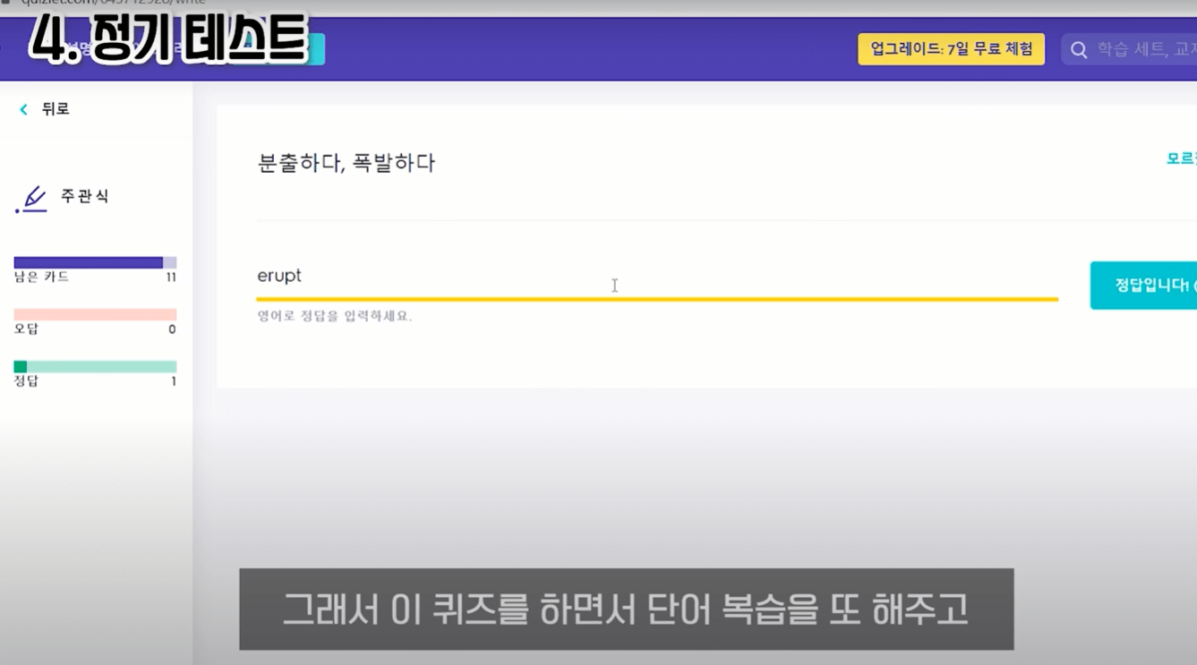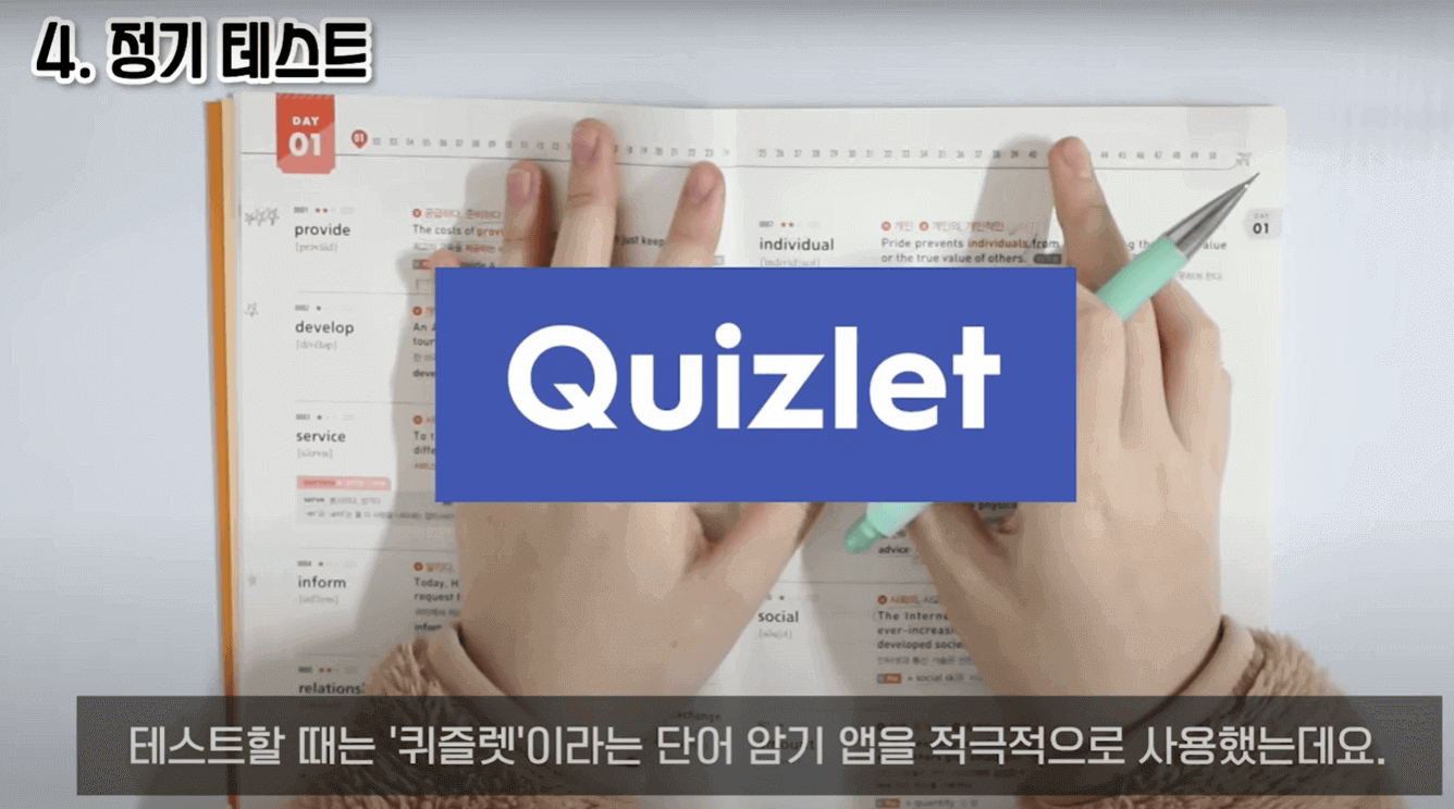 - 일주일, 한달마다 테스트(퀴즐렛 앱 활용)
