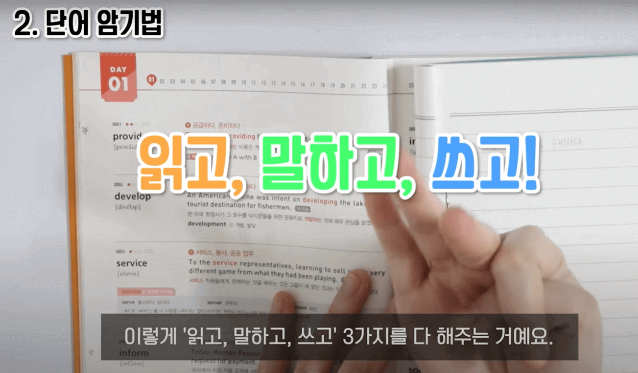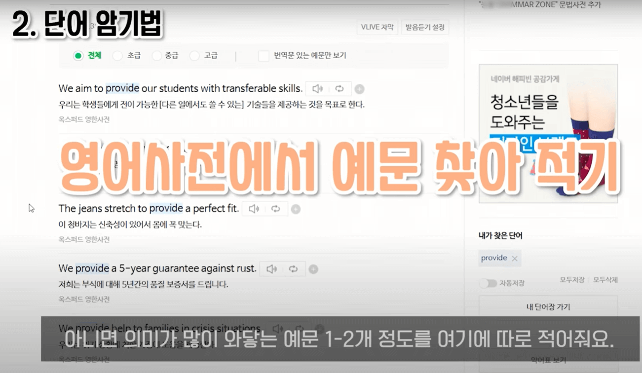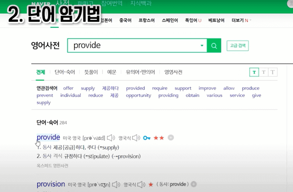 워드마스터 수능 2000 같은 경우는 날짜별 즉 DAY별로 나눠져 있는 걸 볼 수가 있습니다. DAY1부터 공부를 한다고 생각해보겠습니다. 그러면 이 챕터에 있는 단어들이 도입부에 다 나와 있습니다. 이 단어들을 하나하나 보면서 뜻을 말해봅니다. 그리고 다음 장으로 넘겨서 뜻을 확인하고 내가 몰랐던 단어는 단어 옆에 별표를 쳐줍니다. 이렇게 별표를 해 놓는 게 굉장히 중요한데, 나중에 또 복습을 하면서 까먹은 단어들은 별표를 또 표시해줘야 합니다. 별표가 몇 개 있느냐에 따라 그 단어의 중요도가 달라지기 때문에 별표 치는 것이 굉장히 중요합니다. 이제 본격적으로 단어 암기를 해줍니다. 영어 단어랑 뜻이 있으면 "provide, 공급하다, 준비하다" 이런 식으로 단어와 뜻을 소리 내어 여러 번 읽어줍니다. 그리고 눈으로도 계속 반복해서 읽고, 종이에도 써 봅니다. 이렇게 읽고, 말하고, 쓰고 3가지를 다 해주는 것이 중요합니다. 즉, 다양한 감각을 사용할수록 암기가 효과적으로 됩니다. 또한, 영어 단어 바로 밑에 있는 예문이 매우 중요합니다. 단어의 뜻만 기계적으로 암기하기보다는 실제 문장에서 어떤 뉘앙스로, 어떤 형식으로 쓰이는지를 알아야 영어 독해에서 의미 파악을 제대로 할 수 있기때문입니다. 그래서 예문을 풍부하게 공부하셔야 합니다. 단어장에 나와 있는 예문들은 당연히 꼼꼼하게 다 읽고 해석을 해줍니다. 그런데 이런 예문들이 딱히 와닿지 않는다 싶으면 네이버 영어사전에 provide를 검색합니다. 그러면 많은 예문이 뜨는데, 그중에 단어가 자주 쓰이는 덩어리라든가 아니면 의미가 많이 와닿는 예문 1~2개 정도를 따로 적어줍니다. 이렇게 전체 단어를 다 공부를 해줍니다. 이제 다시 앞으로 가서 또 반복해서 암기해 주고, 단어를 왐벽하게 암기해 줍니다. 암기를 웬만큼 했다 싶으면 단어 테스트로 넘어갑니다. 테스트를 보고, 틀리면 또 그 단어에 별표 하나를 더 쳐줍니다. 그리고 별표 친 건 다시 복습을 해줍니다. 이게 하루 공부법입니다.