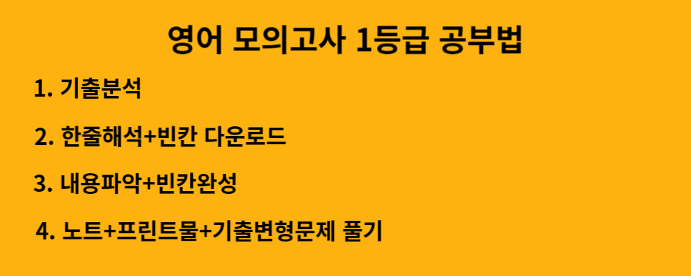 모의고사 공부법은 총 4단계로 나뉩니다. 1단계는 기출문제 파악, 2단계는 모의고사 한 줄 해석 시험지와 해석 있는 빈칸 시험지를 다운로드, 3단계는 내용파악과 빈칸완성, 4단계는 학교 선생님의 노트필기와 프린트물을 확인과 기출변형문제 풀기가 주된 내용입니다.