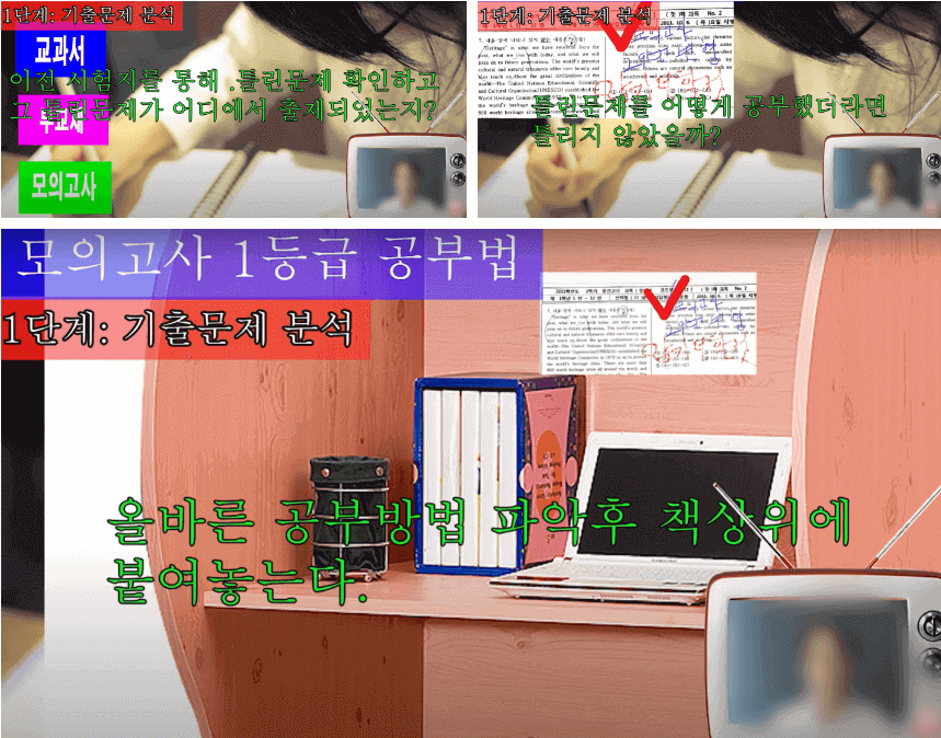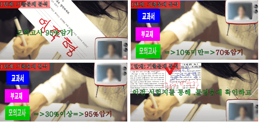 1단계는 각 학교별 기출문제를 파악해야 합니다. 기출문제를 파악해야 하는 첫 번째 이유는 학교별로 영어 난이도를 먼저 파악해야 하기 때문입니다. 단답형 문제가 많은지, 어떤 주어진 단어의 배열문제가 많은지, 아니면 완전히 영작문제인지 파악해야 합니다. 만약에 단답형 문제가 많으면 모의고사 시험범위 50%를 암기하고 주어진 단어의 배열형 문제가 많으면 모의고사 시험범위의 70%를 암기해 줍니다. 영작문제가 많으면 모의고사 시험범위의 95%를 암기해야지만 내신영어 1등급이 나올 수 있습니다. 기출문제 분석을 하는 두 번째 이유는 교과서, 부교재, 모의고사의 출제비율을 파악하기 위해서입니다. 만약 모의고사 출제비율이 10% 미만이면 시험범위 전체 지문의 70% 정도만 암기하면 됩니다. 그런데 모의고사 출제비율이 30% 이상이면 시험범위가 많은 것이기 때문에 전체 시험범위 지문의 95% 정도를 암기해야 합니다. 기출문제를 분석하는 세 번째 이유는 이전 시험지를 통해서 자신의 틀린 문제를 확인하고 그 틀린 문제가 어디에서 출제되었는가를 찾아보기 위해서입니다. 그 틀린 문제가 교과서에 나왔는지, 부교재에서 나왔는지 아니면 모의고사에서 나왔는지 파악해 보기 위해서입니다. 그리고 그 틀린 문제를 지난번 시험에 자신이 어떻게 공부했더라면 틀리지 않았을까를 많이 고민해야 합니다. 그 올바른 대비방법에 대해서 빨간펜으로 시험지 위에 적어놓고 책상 위에 붙여놓습니다. 그러면서 시험공부 대비를 하면서 책상 위에 붙여놓은 틀린 문제를 보면서 계속 주지하면서 그 틀린 문제를 틀리지 않기 위한 방법으로 공부하시면 됩니다. 학교별 기출문제 분석이 끝났으면 두 번째 단계로 넘어가야 합니다.
