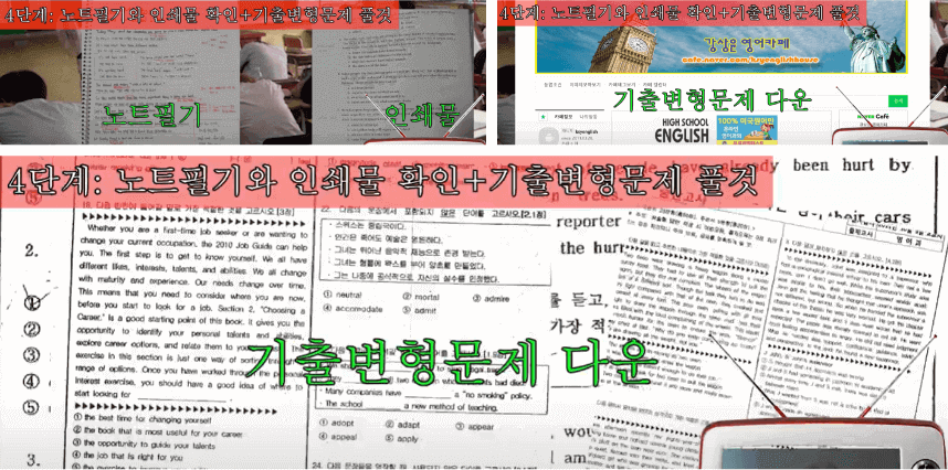4단계는 시험 출제자인 선생님의 노트필기와 인쇄물을 확인하시고 영어카페에 들어가시면 모의고사 기출변형문제가 많이 있습니다. 기출변형문제 100문제 정도를 반드시 거기에는 서술형 문제가 포함된 100문제 정도를 다운로드하여서 푸시면 됩니다. 특히, 틀린 문제는 왜 틀렸는지 파악하고 다시 공부하셔야 합니다. 그런데 그 틀린 대부분의 이유는 완벽하게 암기를 하지 않아서인 경우가 대부분입니다. 철저하게 모든 문장을 암기하셔야만 합니다.
