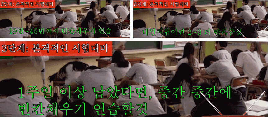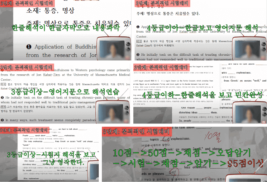 3단계는 본격적인 시험대비를 해야 합니다. 한 줄 해석본이 있는 한글 자막을 보시고 내용 파악을 해야 됩니다. 일반적으로 두 번에서 세 번 정도 반복을 하면 글의 주제라든지 요지나 목적을 파악할 수 있습니다. 파악한 주제, 소재, 요지, 목적 등을 시험지에 빨간색 펜으로 옮겨 적습니다. 그렇지만 일반적으로 한줄헤석을 만드신 선생님들께서 이미 소재나 주제 등을 파악해서 적어놓은 경우도 많이 있습니다. 글의 내용이 파악되었다면 4등급 이하인 학생들은 한 줄 해석이 나와있는 그 한글해석을 보시고 영어지문 해석하는 연습을 하시면 됩니다. 3등급 이상의 학생들은 한 줄 해석에 나와있는 한글 해석을 보지 말고 영어지문만 보고 해석하는 연습을 합니다. 이렇게 모든 모의고사 문제를 18번에서 45번까지 끝까지 공부(전 지문 해석연습)해야 됩니다. 4등급 이하인 학생들한테는 힘들 수가 있지만 그래도 계속 연습을 하셔야 1등급을 받을 수 있습니다.